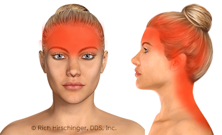 As tension-type headaches are caused by built up muscle tension in the neck or scalp, a massage may offer some initial pain relief. Over-the-counter pain medications such as aspirin, ibuprofen, acetaminophen, and naproxen can offer effective relief as well. A hot shower or bath or heating pad may also help loosen the muscle tightness causing the pain. Caffeine may also help to relieve tension-type headache pain by dilating blood vessels and increasing blood circulation to the affected muscle region. Treatment options that Dr. Hirschinger may prescribe include muscle relaxants, certain antidepressants, ethyl chloride, trigger point injections, and Botox. Lifestyle changes can be adopted to help with the prevention of headaches in the future, including changing sleep habits, increased exercise and stretching the neck, back and shoulder muscles if long periods of time at a desk or computer are a required part of a headache sufferer’s job or lifestyle, as well as stretching the closing muscles of the jaw, which, when overused, can referred pain into the temples. Dr. Hirschinger is the inventor of the gentle jaw, which helps stretch the closing muscles of the jaw. It is critically important that patients keep their teeth apart during the day since if the teeth are held together, this can and will lead to increased pain and increased tension-type headaches.