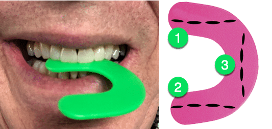 Every morning, you need to stretch your lateral pterygoid muscles, which are the muscle that enables you to move your jaw forward and side-to-side. This muscle is held forward by the appliance when you are sleeping, so you need to stretch it back in the morning after removing your mandibular advancement device. Dr. Hirschinger will give you a bite wafer, which one of his patients called a “chew toy,” to stretch the lateral pterygoid muscles. You place your upper front four teeth on the wafer, squeeze your teeth backwards for 10 seconds, rest for a few seconds, and repeat this 2 more times. Then check your bite. It should feel the same as it did before you started wearing the mandibular advancement device. If it doesn’t feel normal, repeat these steps for another three repetitions. Some patients need to repeat this up to six times each morning until their bite feels normal. This is only done in the morning.