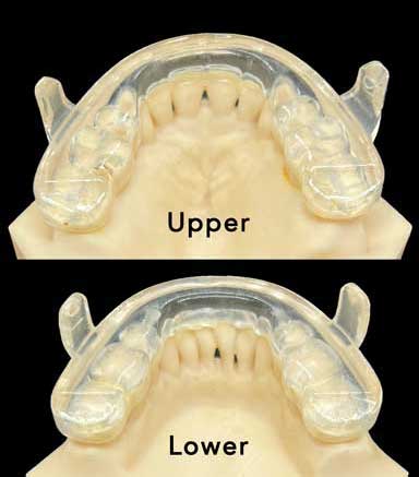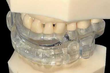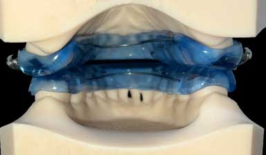 This is the Prosomnus appliance. You can see the back of the front teeth on the upper and lower arches. This means the tongue has room to rest against the back of these teeth, which increases the effectiveness of the appliance.
